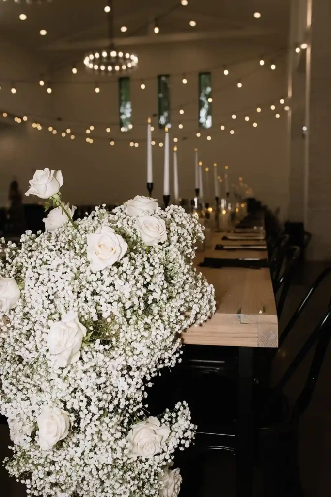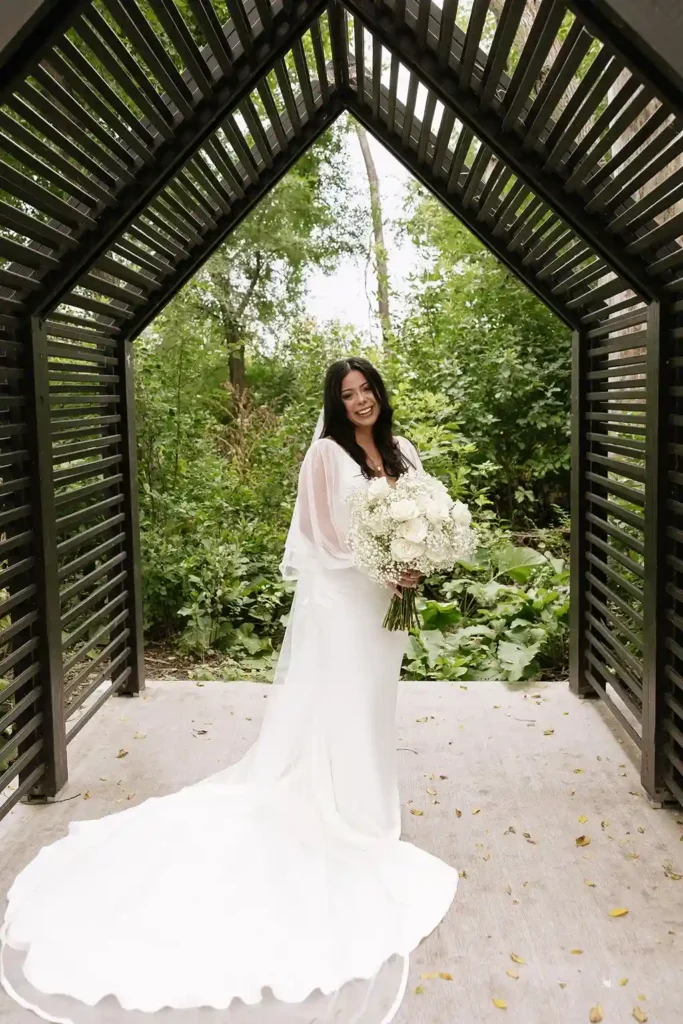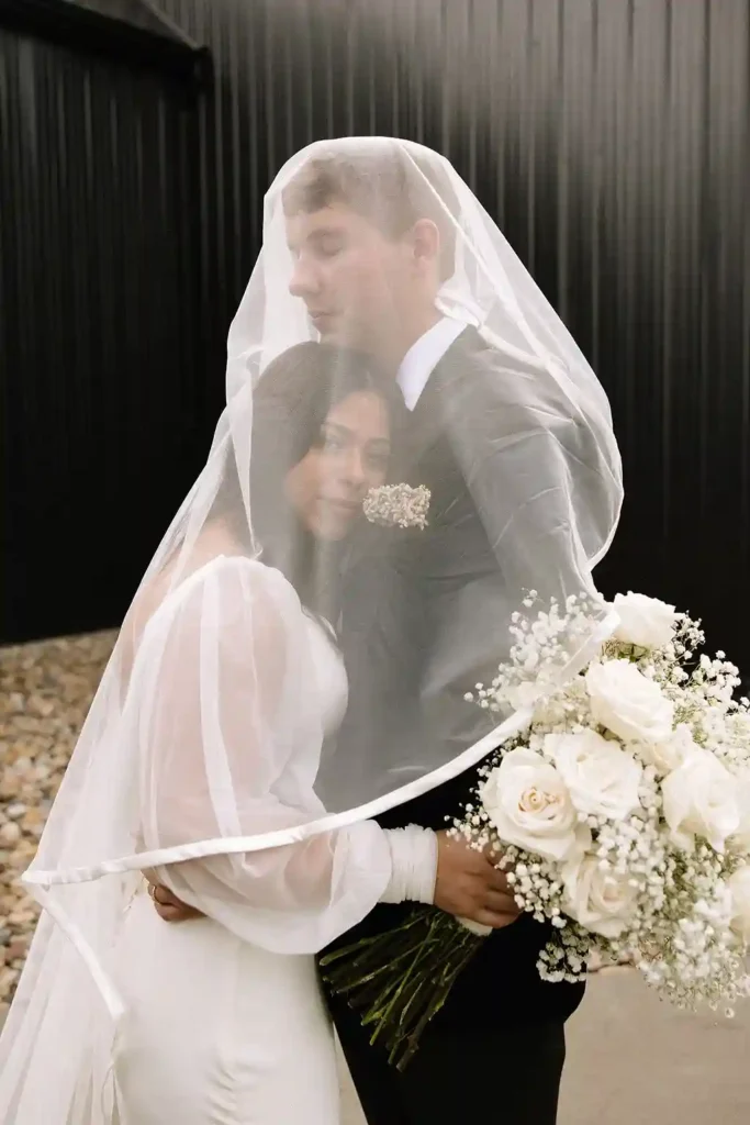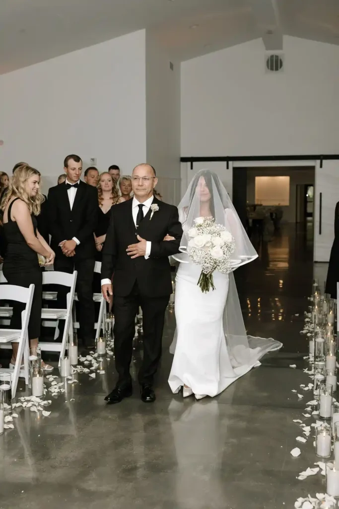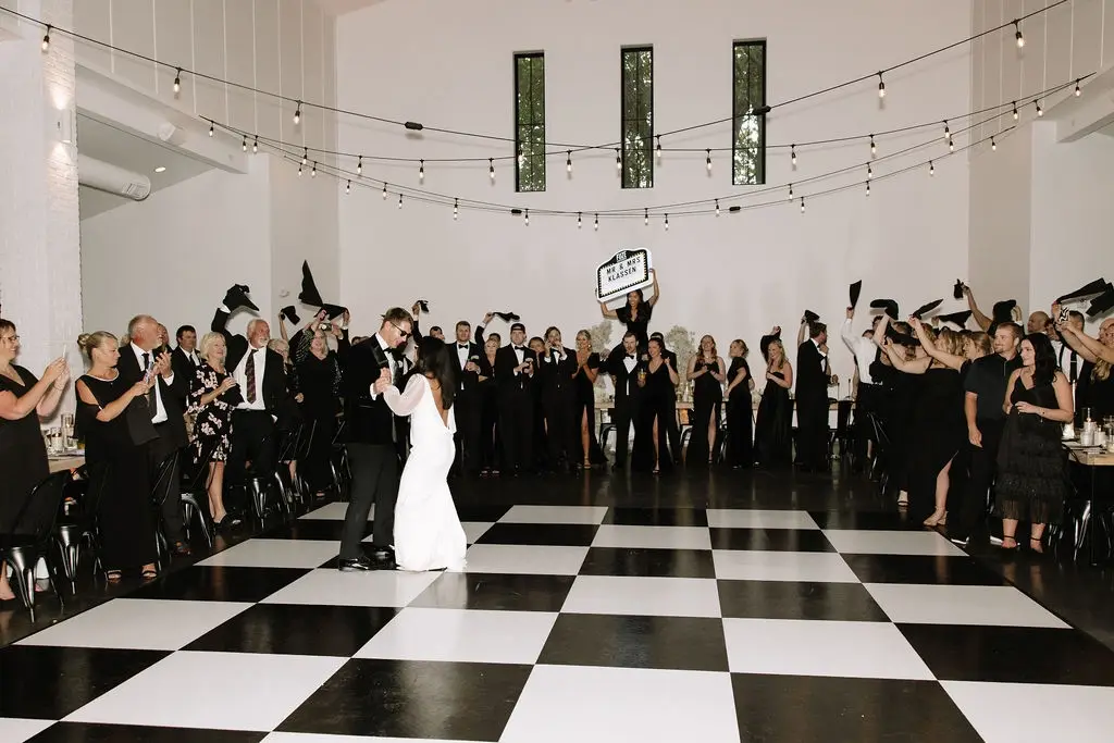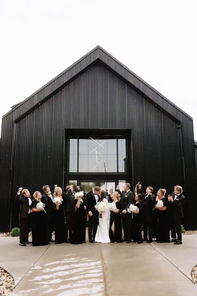 Saturday, September 13, 2025 – This celebration at The Pines Weddings & Events shows a classy, black and white wedding designed for a 250-guest count in the Fargo-Moorhead area. This North Dakota love story shows the beauty of a neutral-color palette in our Pines Black venue. Featured in this blog is an on-site ceremony, white florals, black bridesmaid dresses, and a modern aesthetic to build off of the industrial Pines Black atmosphere. Some of Fargo’s premier wedding vendors helped to make this day special including: Fuze Entertainment as the wedding DJ and a buffet-style wedding dinner by Chef’s Table catering. The lovely photography done by Drops of Grace Photography captured this day and our space beautifully.