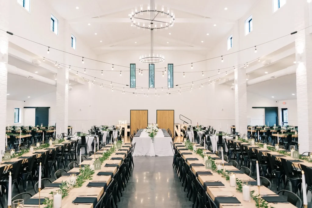This celebration is a great reference for couples that are searching for a luxury farm wedding venue near Fargo, ND. Pines White is a rustic wedding venue in Fargo ND that can comfortably host 300+ guests with its indoor ceremony, expansive reception hall, and guest prep suites located in the lounge. The Pines venues are great for seamless on-site flow from ceremony to reception with efficient bar and service placement. Flexible table layouts demonstrate how larger guest counts can still feel organized, elevated, and intentionally designed without the need for multiple venue locations, or traveling through out your wedding day. Both of the Pines elegant venues, Pines White and Pines Black are perfect for hosting your special day, all in one-place.