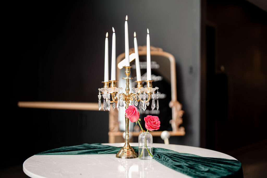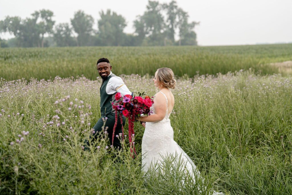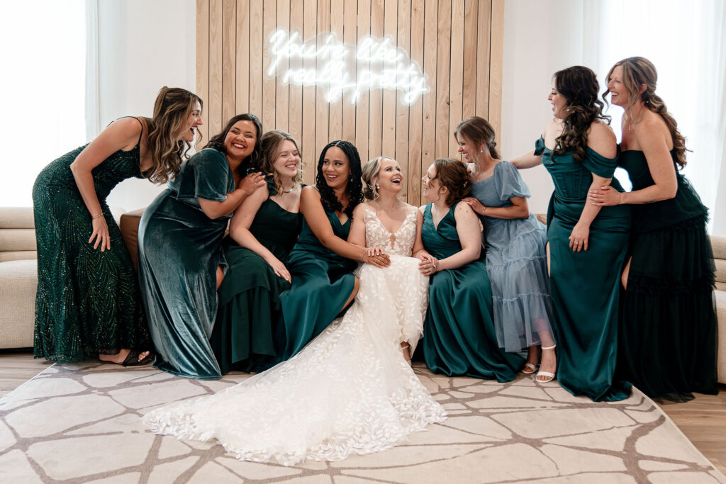 Saturday, July 12, 2025 – This celebration at The Pines Weddings & Events shows a beautiful, green and crimson wedding designed for a 159-guest count in the Fargo-Moorhead area. This North Dakota love story shows the beauty of a classy, vintage celebration in our Pines Black venue. Featured in this blog is an off-site ceremony, bold florals, green bridesmaid dresses, and a rich touch to the industrial Pines Black atmosphere. Some of Fargo’s premier wedding vendors helped to make this day special including: Fuze Entertainment as the wedding entertainment and a plated-style wedding dinner by Chef’s Table catering. The lovely photography done by Dynamic Studios captured this day and our space beautifully.